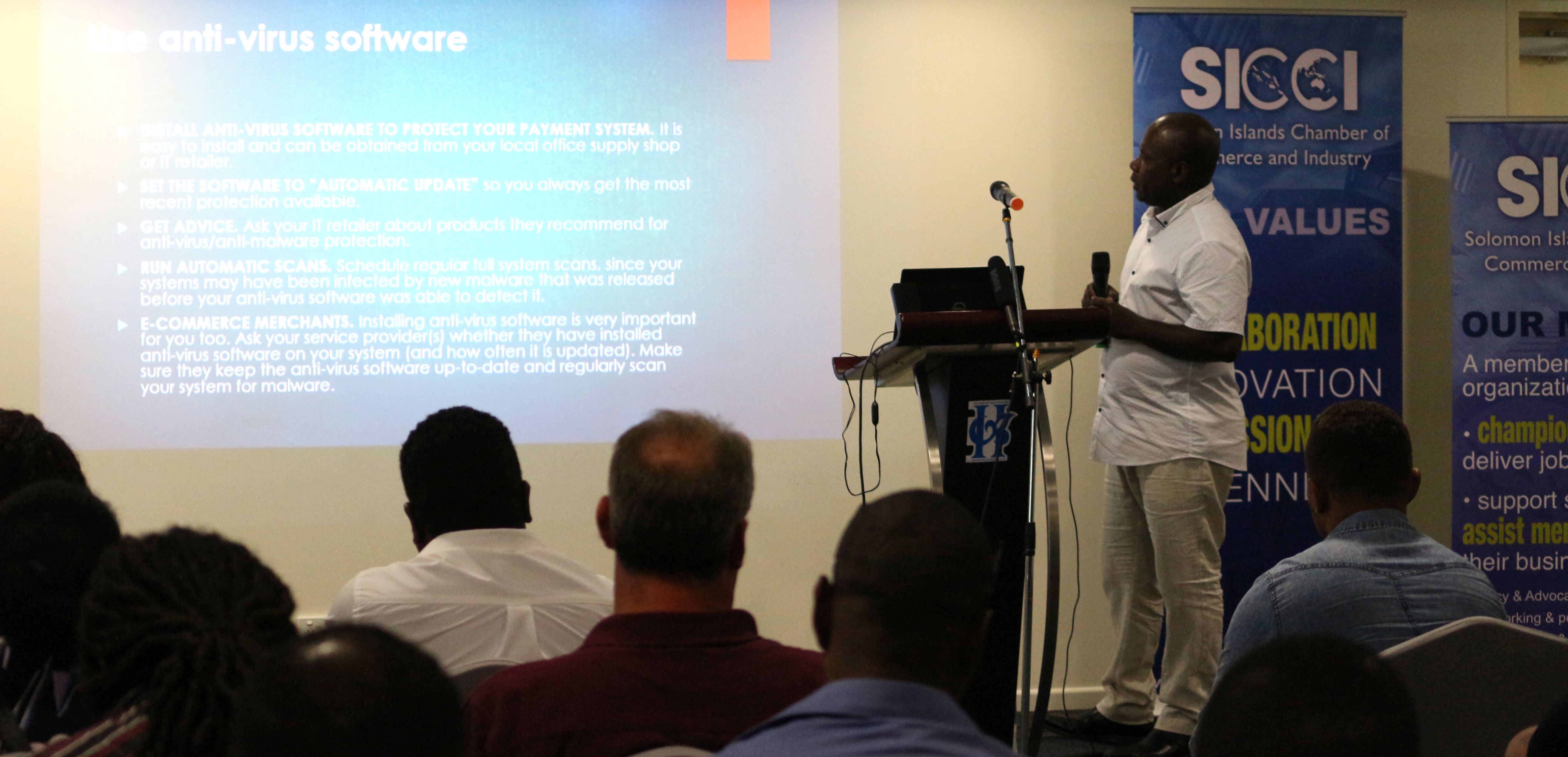 Some of the topics covered during the session included the history of telecommunication in the Solomon Islands, Information on the fibre optic cable project, the payments systems and the customers bank card data, simple standards to secure your system and customers bank card data, the Solomon Islands Governments Policies and examples of Cyber Crime.