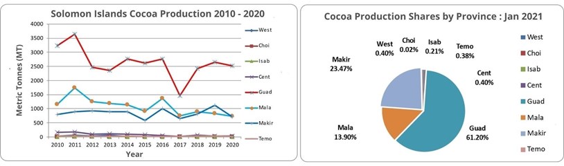 Fig 1.1 - Solomon Islands Cocoa Production 2010 - 2020 and Production shares by each province.