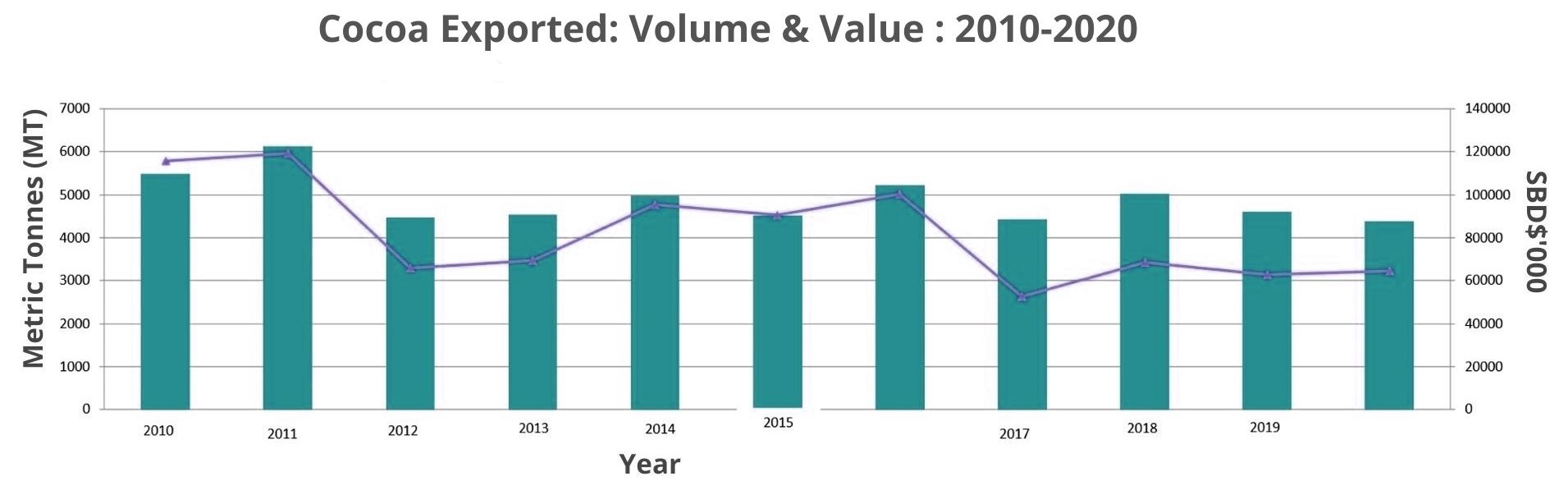 In addition, figure 1.2 below shows the Solomon Islands export by volume and value. Cocoa production peaked in the Solomon Islands between 2010-2011 and has plateaued since.
